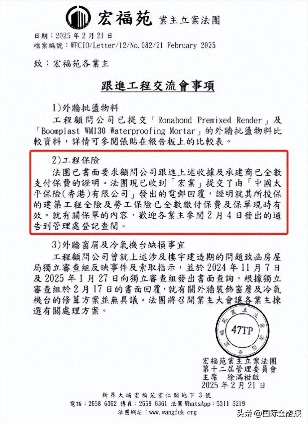 《国际金融报》记者在宏福苑业主立案法团网站注意到,今年2月21日发布的一份《跟进工程交流会事项》文件显示,针对工程保险事项,法团已收到宏业建筑工程有限公司提交的由中国太平保险(香港)有限公司发出的电邮回复,证明就其所投保的建筑工程全险及劳工保险已全数缴付保单及保单现时有效。