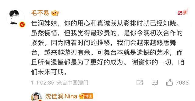 而毛不易的暖心回应更让这场致歉成为双向奔赴的温情时刻,他在评论区写道:“你的用心和真诚我从彩排时就已经知晓,虽然惋惜,但很珍贵,所有遗憾都是为了更好的成为”,这番鼓励让沈佳润感动回应:“不易哥哥,往前走,用力握住哥哥的手”。一歉一慰之间,舞台失误的尴尬被人与人之间的善意取代,也让公众看到了年轻艺人应有的谦逊与前辈的格局。