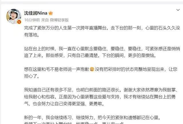 表演结束后,#沈佳润跑调# #毛不易工伤# 等话题迅速冲上热搜,批评与调侃声浪汹涌而来。就在舆论发酵的风口浪尖,2026年1月1日凌晨一点多,沈佳润发布长文致歉,用最朴素的真诚化解了部分争议。